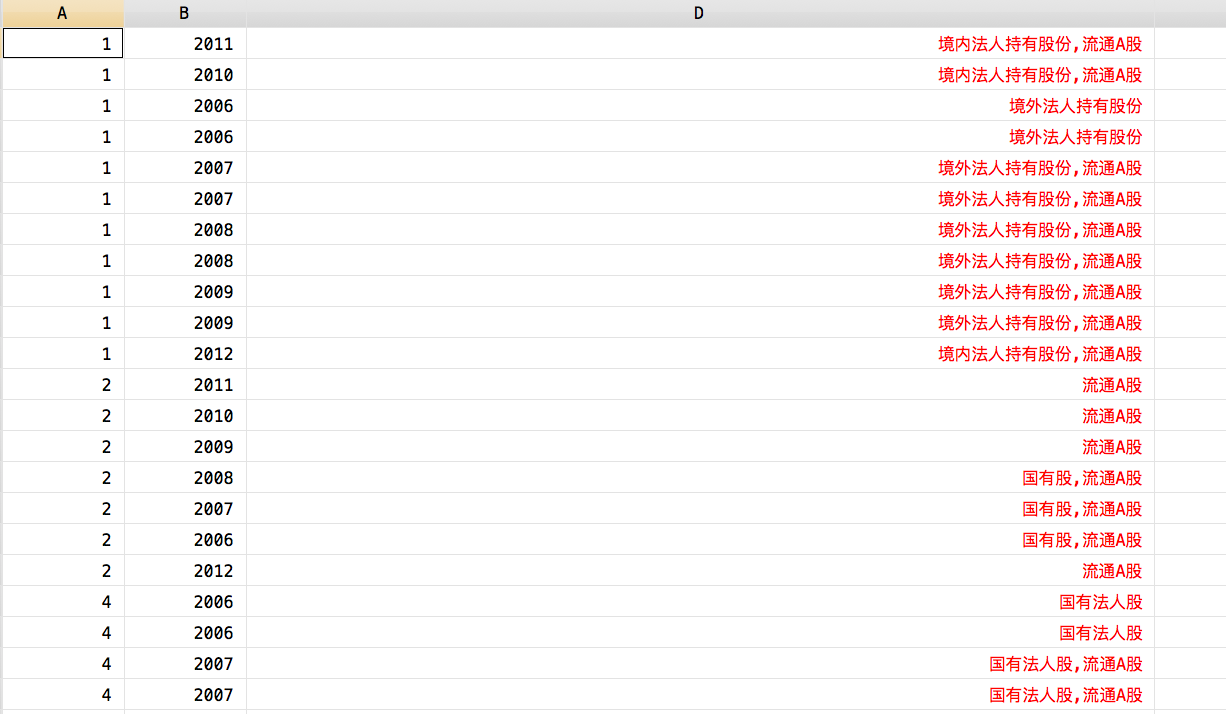 各位大神,数据如图所示。我需要生成虚拟变量s-dum,所有国有控股都为1(包括国家股,国有法人股)我用了命令 gen s_dum=0.replace s_dum=1 if substr(D,1,2)==“国”,可是没用。求各位大神 十分着急 跪谢