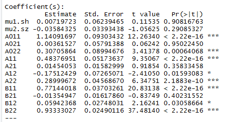 请问用R的mts跑出来的bekk结果如上图,怎么看波动溢出方向?大神们