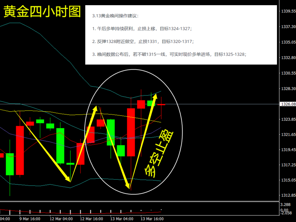 黄金昨日开盘在1322.81一线,早间小幅上涨至1326一线开始下跌,直至晚间美盘数据刚出的时候,黄金最低一度跌至1313.56一线,我们布局的多单成功进场。随后由于美国解职的消息传来,黄金就开始反弹,最高涨至1328一线,我们的多单成功止盈12美金,后开始走跌最低至1318一线,我们的空单也再次获利10美金。午夜黄金再次暴涨最高至1328.19一线,最后日线在1325.8收取阳线,具体可在文章《黄龙点金:3.13黄金晚间操作建议,晚间CPI数据布局》中查看。