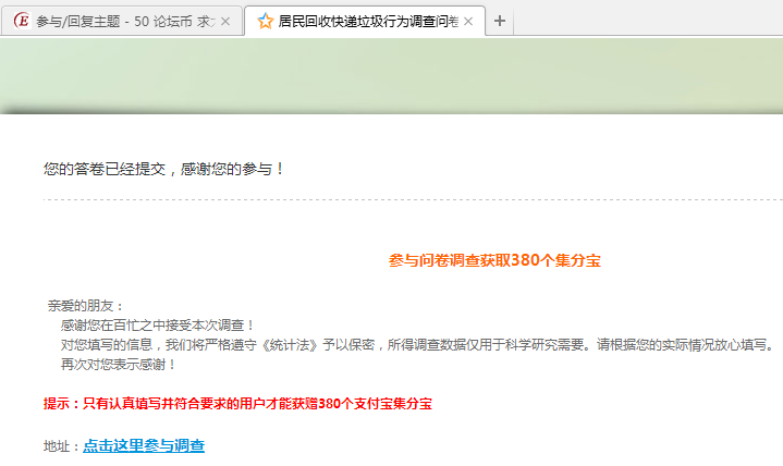 bill1220 发表于 2018-3-16 16:28 您的答卷已经提交,感谢您的参与! 参与问卷调查获取40个集分宝