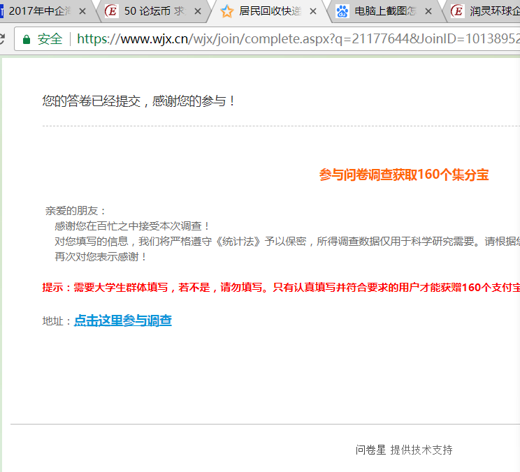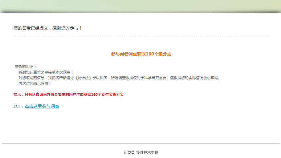 Echofleet 发表于 2018-3-19 09:46 问卷已完成,第一次不太会,截图是截最后的“您的答卷已经提交,感谢您的参与!”这个地方的图片么?