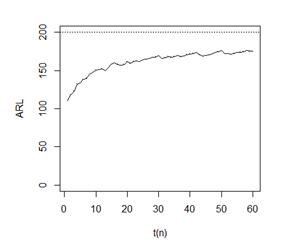 plot(x,y,ylim=c(0,200),xlab="chisq(n)",ylab="ARL",pch=".",lty=1,type="o")