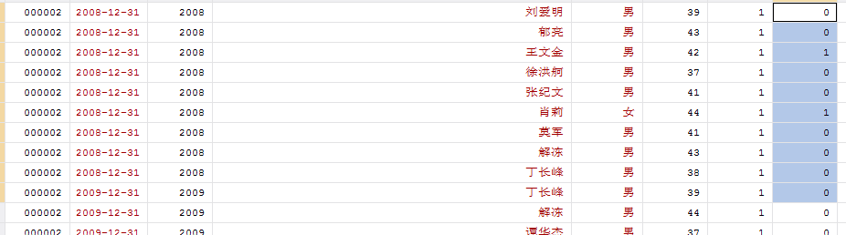 比如我要看000002公司2008年有几个=1数据(蓝色区域),stata用什么命令?谢谢!
