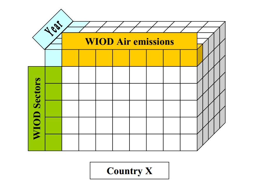 图片的解释:The air emission account data of the WIOD satellite database are presented in Excel format where each year is recorded as a single sheet in which there is a single row (WIOD sectors) and column (air emissions) dimension.