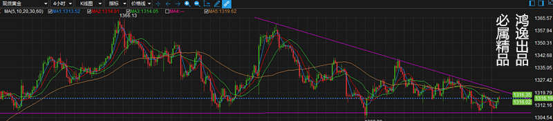 说句实在话,在重大事件及经济数据公布时,技术面往往会显得很无力,作用几乎为零了。但鸿逸还是给大家先分析一下目前盘面的情况。首先,目前整体趋势还是看空的,只要不突破4H图的下行通道上轨,黄金还是以高空为主。日图上面给的趋势很模糊,那么我们可以细化或者扩大话,这样就能对行情有更精准的了解。从周图看,Macd以及KDJ等指标均出现死叉,MA5日均线也下穿了MA10日均线,大体趋势是看空向下。另一方面4H图趋势也依旧是在下行通道内。