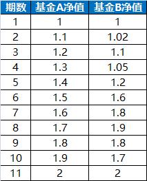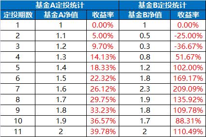 假设我们开始定投两只同样类型的基金,一共定投11期,看下表: