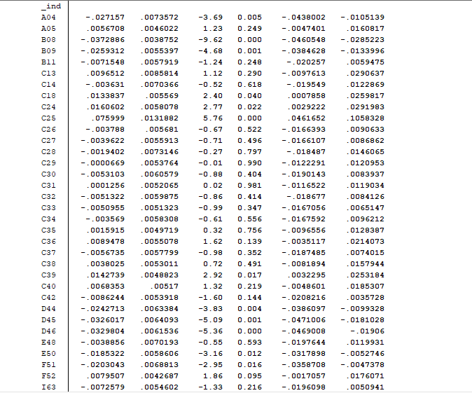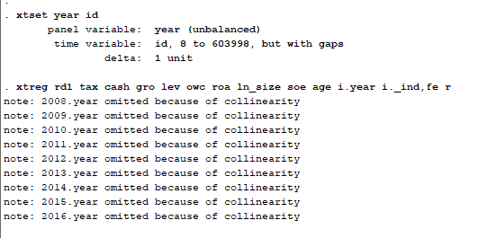 各位大神,小女子刚写实证论文,stata有诸多问题,还望大家指导一二!我要研究1000多家上市公司的研发投入与其他解释变量之间的关系,是非平衡面板数据。经过hausman检验,应用固定效应模型。但在加行业和时间控制变量时,出现共线性(我的企业所处行业是不随时间变化的)。特请教大家!我把命令和回归结果贴出来。先开始我用了xtset id year ,结果所有的行业虚拟变量全部被omitted,后来设置了xtset year id,所有的年份被omitted,请问大神这是什么原因?我应该怎么正确加入行业和时间控制变量。