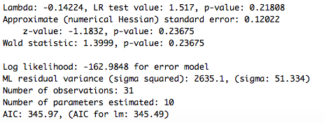 b<-errorsarlm(V1~V2+V3+V4+V5+V6+V7+V8,data = x,listw = listw)