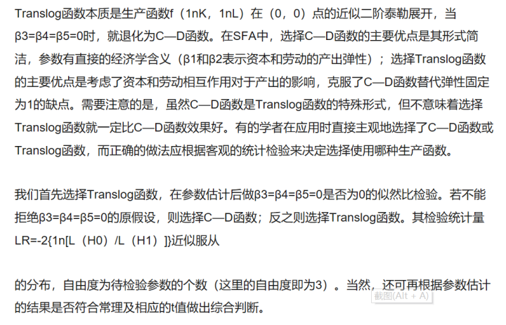 在frontier回归中会有模型选择的检验,一般为系数等于零的原假设,请问原假设作出后如何进行具体的回归?比如C-D函数与超越对数函数的选择中,我们有原假设H0:beta3=beta4=beta5=0,看到一些回复说,删除系数为零的项(即删除beta3、beta4、beta5这三项),然后进行回归再对照LR值进行判断(请问是这样吗?),若拒绝原假设则为超越对数模型,若不能拒绝原假设则为C-D模型。类似这样,还有技术中性进步假设以及无效率项是否存在的假设,请问怎样进行具体的操作?