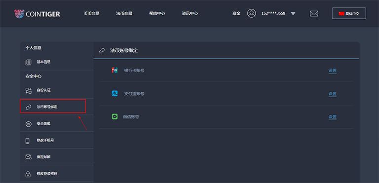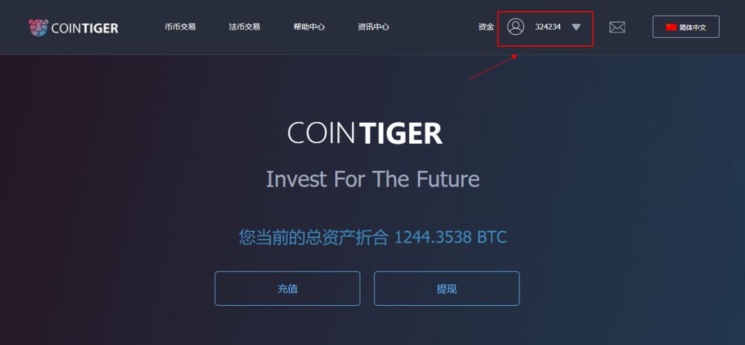 1.登录CoinTiger官网www.cointiger.com,实名认证后点击个人中心按钮。