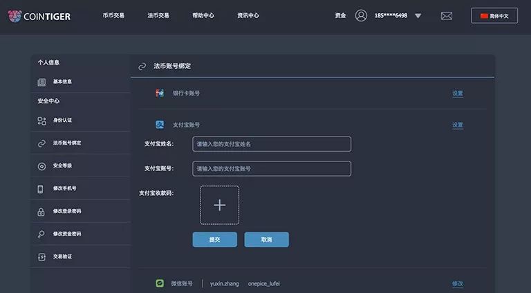 2.进入个人中心界面后点击法币交易账号绑定,会看到如下界面。