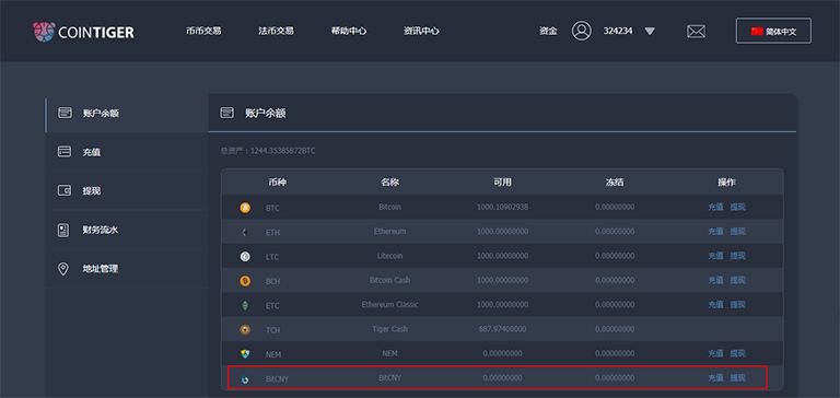 6. 在这里可以看到已经冲入的BitCNY数量,确认充入数量无误后,就可以直接前往币币中心进行交易啦!