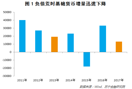 在此,回顾2013年和2017年的两次负债荒,可以观察到基础货币余额增量明显萎缩(参见图1)。