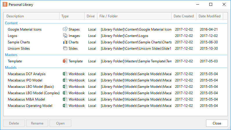 - Macabacus supports 3 libraries—a personal library for individual use, and team and company libraries that can be shared