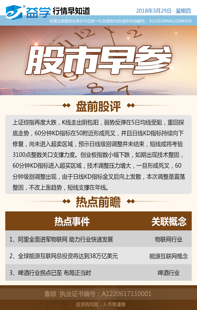 上证综指再度大跌,K线走出阴包阳,弱势反弹在5日均线受阻,重回探底走势,60分钟KD指标在50附近形成死叉,并且日线KD指标持续向下修复,尚未进入超卖区域,预示日线级别调整并未结束,短线或将考验3100点整数关口支撑力度。创业板指数小幅下跌,如期出现技术整固,60分钟KD指标进入超买区域,技术调整压力增大,一旦形成死叉,60分钟级别调整出现,由于日线KD指标金叉后向上发散,本次调整是震荡整固,不改上涨趋势,短线支撑在年线。