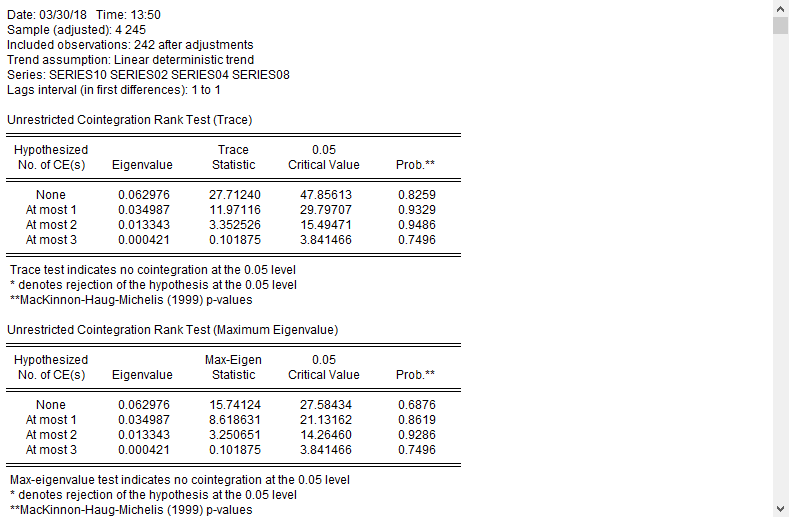 想做四只银行股的协整关系检验,已经用EG检验出其中两只有协整关系,并且都是一阶单整的时间序列。但是用jj检验出来不管选择哪种情况都是显示一个协整关系都没有?甚至删掉一个或两个变量以后P值还是巨大无比。。。是哪里出了问题呀?求好人解答!!