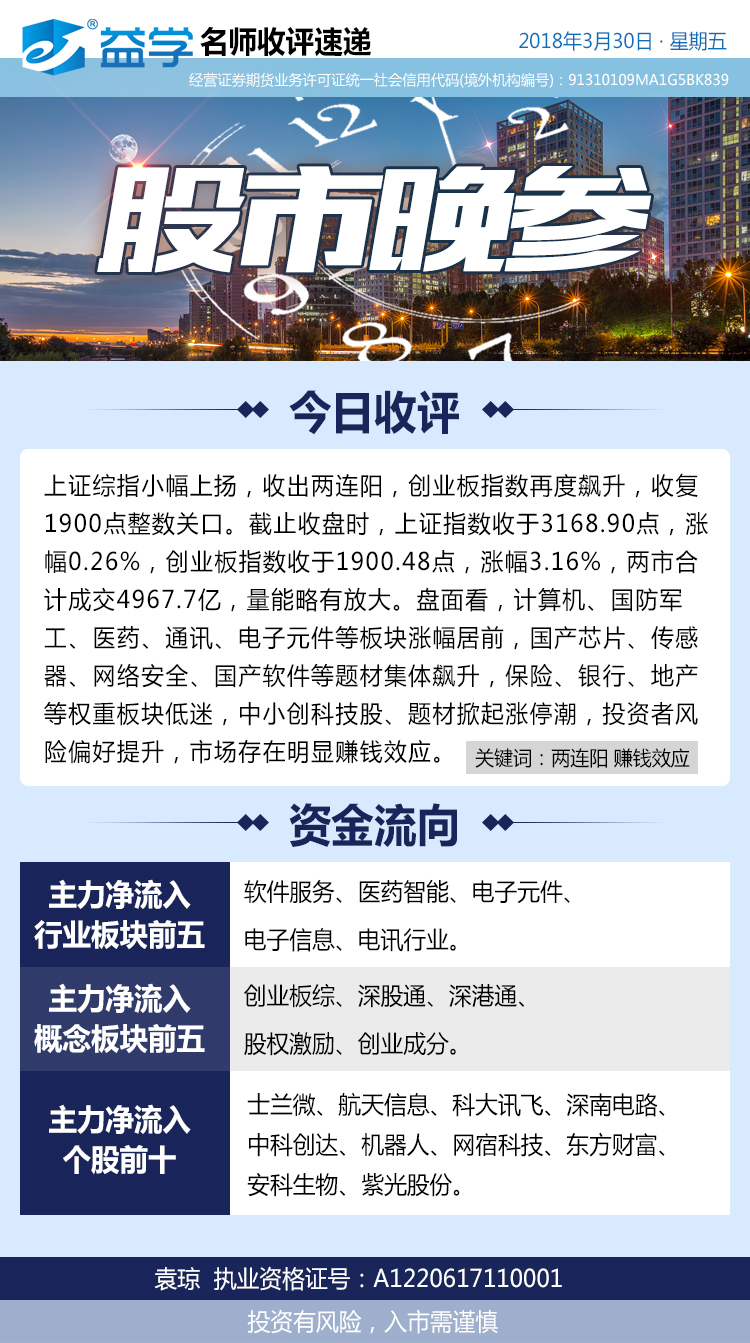 上证综指小幅上扬,收出两连阳,创业板指数再度飙升,收复1900点整数关口。截止收盘时,上证指数收于3168.90点,涨幅0.26%,创业板指数收于1900.48点,涨幅3.16%,两市合计成交4967.7亿,量能略有放大。盘面看,计算机、国防军工、医药、通讯、电子元件等板块涨幅居前,国产芯片、传感器、网络安全、国产软件等题材集体飙升,保险、银行、地产等权重板块低迷,中小创科技股、题材掀起涨停潮,投资者风险偏好提升,市场存在明显赚钱效应。