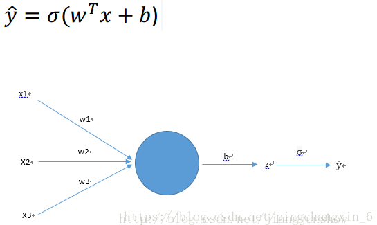 上图第一个公式中的x是个(n,1)维的矩阵,表示一个训练样本,里面的n表示一个训练样本中的特征数量,例如一张图片就是一个训练样本,图片中每个颜色强度值就是一个特征;w也是一个(n,1)维的矩阵,它表示权重(weight),它一一对应于每个输入的特征,也可以说它指示了某个特征的重要程度;b是一个实数,在这里可以将其看作为一个阀值。