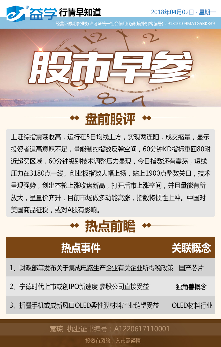 上证综指震荡收高,运行在5日均线上方,实现两连阳,成交缩量,显示投资者追高意愿不足,量能制约指数反弹空间,60分钟KD指标重回80附近超买区域,60分钟级别技术调整压力显现,今日指数还有震荡,短线压力在3180点一线。创业板指数大幅上扬,站上1900点整数关口,技术呈现强势,创出本轮上涨收盘新高,打开后市上涨空间,并且量能有所放大,呈量价齐升,目前市场做多动能高涨,指数将惯性上冲。中国对美国商品征税,或对A股有影响。