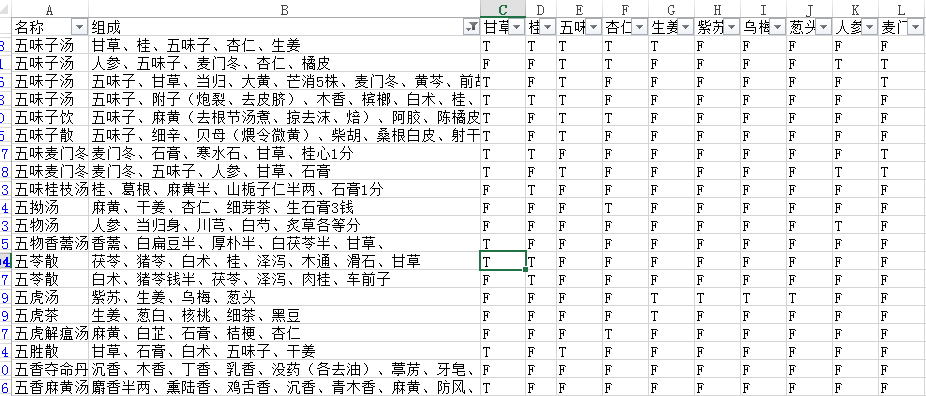 ,用SPSS软件做每味药之间的聚类和关联规则,目前遇到的困难就是需要把每一个方剂名称中的组成元素标记为T和F,我自己手工做了一些,但发现数据量实在是太大了,不知道有没有什么除了编程能够解决的方法,求各位解答!