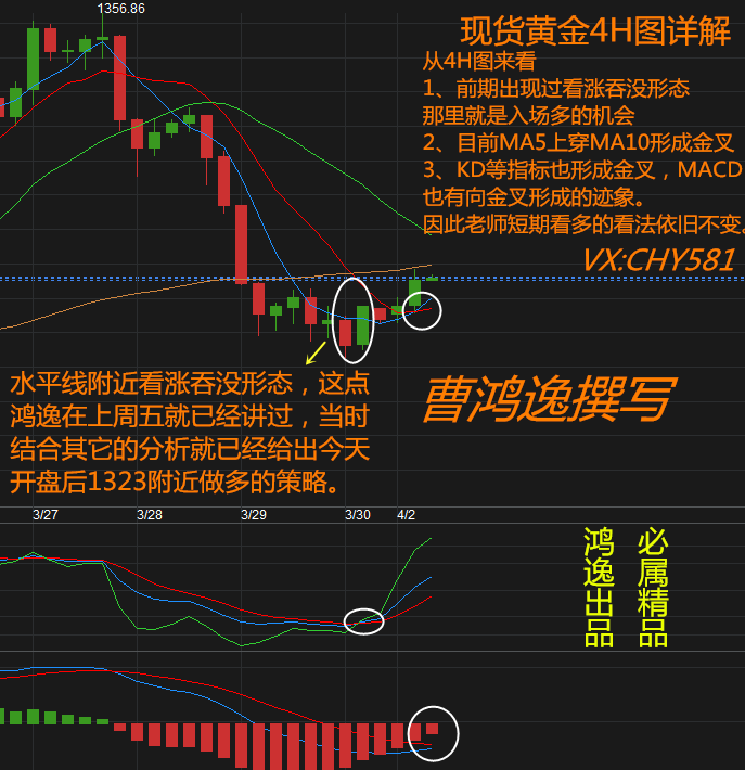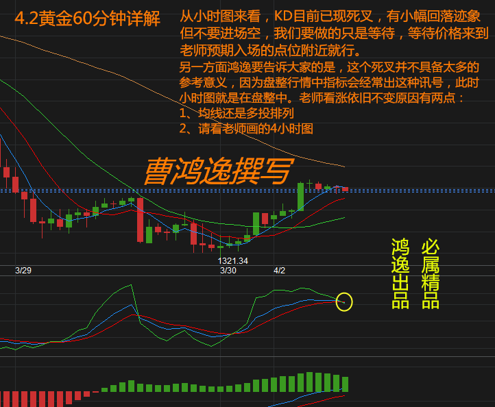 就拿今天的行情来说,老师周五(3月30日)就有给出了今天的操作策略提到:4月2日开盘后,行情短期先看涨,在1323附近入场做多。如果之前你有好好看老师的文章,那么今天早间低点(1324附近)时就可以果断入场了,到高点1332除去点差也有7美元的盈利了,在这种波动不是很大的时候,这已经是非常大的收益了。白天的已经赚到了,现在我们再来看看美盘