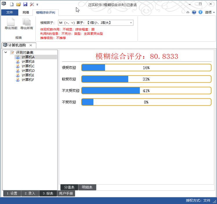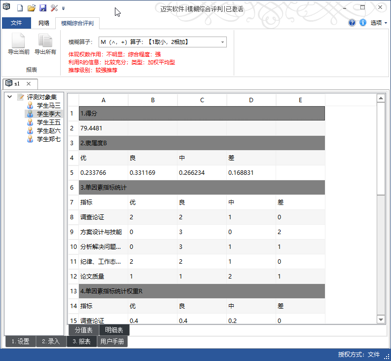 4. 详细的过程数据- 迈实模糊综合评判软件可为使用者提供汇总表,分值表,隶属度矩阵B,单因素指标统计权重R,指标间权重A等等各种所需的过程数据,方便使用者对这些过程数据的后续文档操作。