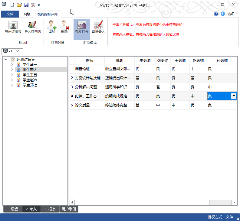 2. 快速专家打分录入:- 迈实模糊综合评判软件提供“专家打分”和“直接录入”两种的分值录入方式,前者可看到各专家的打分明细,后者则是快速直接录入各指标的评测结论的人数。同时迈实模糊综合评判软件也可直接导入Excel打分数据。