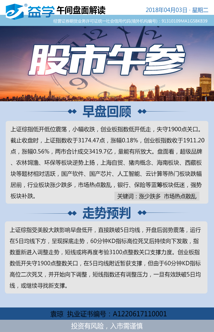 上证综指低开低位震荡,小幅收跌,创业板指数低开低走,失守1900点关口。截止收盘时,上证指数收于3174.47点,涨幅0.18%,创业板指数收于1911.20点,涨幅0.56%,两市合计成交3419.7亿,量能有所放大。盘面看,超级品牌、农林饲渔、环保等板块逆势上扬,上海自贸、猪肉概念、海南板块、西藏板块等题材相对活跃,国产软件、国产芯片、