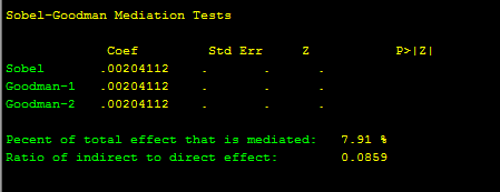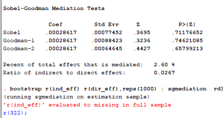bootstrap r(ind_eff) r(dir_eff),reps(1000) : sgmediation Ana , mv( DA ) iv( Sd ) cv( Size Roa Lev Itang Grow Horizon Holder TobinQ Cr Soe Age )
