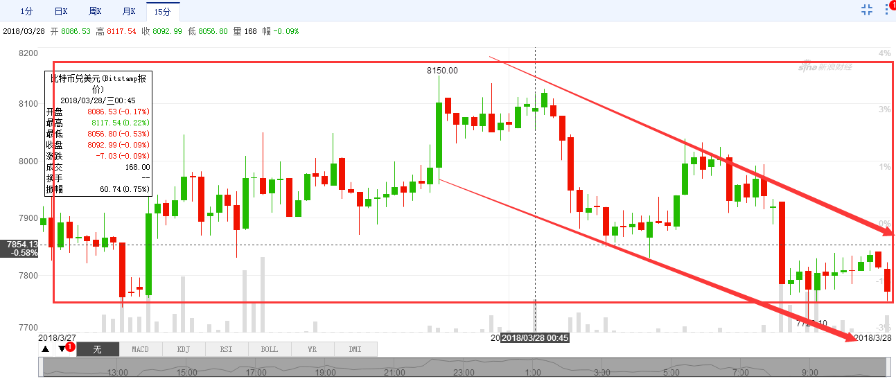 小周期来看,这两天是一个小周期的下跌,现在的趋势可以做空,但因为今天的位置刚好是一个前期低点,所以我们应该谨慎,等待市场突破这根支撑线再进去。