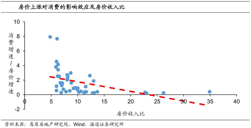 不同城市之间消费的差异实际上与房价高低相关,而非人口变化。房价对消费存在财富效应和挤出效应,在房价处于较低水平的时候,房价上涨会增加居民的总资产,并促进消费;而在房价处于较高水平时,房价上涨往往会增加居民的债务负担和居住开支,从而挤出消费。