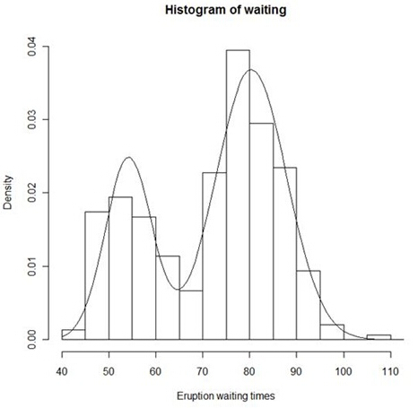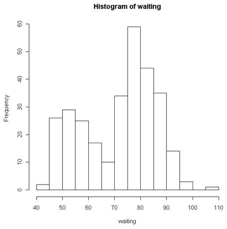 该数据采集自美国黄石公园内的一个名叫Old Faithful 的喷泉。“waiting”就是喷泉两次喷发的间隔时间,“duration”当然就是指每次喷发的持续时间。在这里,我们只用到“waiting”数据,为了简单一点,可以使用attach()函数。