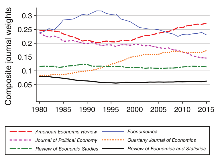 根据谷歌页面排名算法得出的世界经济学期刊前六位——美国经济评论American Economic Review、计量经济学杂志Econometrica、政治经济学杂志Journal of Political Economy、经济学季刊Quarterly Journal of Economics、 经济研究评谕Review of Economic Studies、经济与统计评论,Review of Economics and Statistics这35年的影响力变化如图所示: