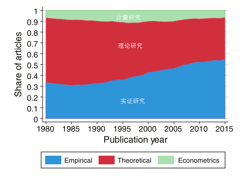 上图不难看出,经济学的实证研究增长非常迅速从1980年代最初占比的30%,经过35年的发展,到2015年已经占到到了整体经济学研究比例的55%,也就是一半以上的经济学论文是实证研究了。