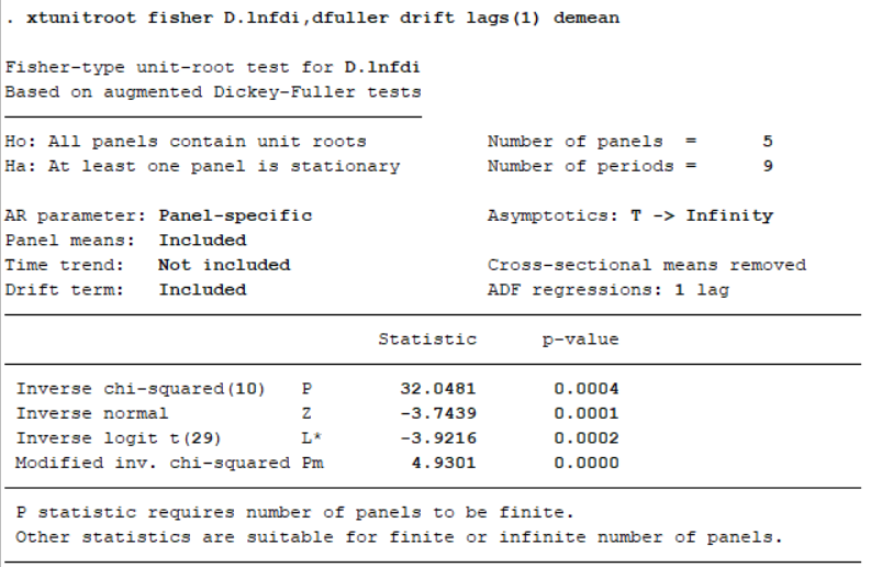 . xtunitroot fisher D.lnfdi,dfuller drift lags(1) demean