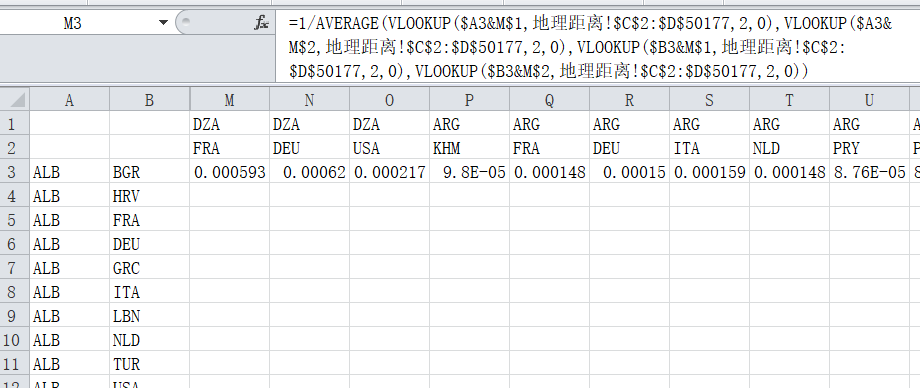 RAGE(VLOOKUP($A3&M$1,地理距离!$C$2:$D$50177,2,0),VLOOKUP($A3&M$2,地理距离!$C$2:$D$50177,2,0),VLOOKUP($B3&M$1,地理距离!$C$2:$D$50177,2,0),VLOOKUP($B3&M$2,地理距离!$C$2:$D$50177,2,0))