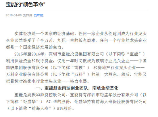 万科独董刘姝威4月8日凌晨发文指责宝能动用巨额保险资金和银行资金损害实体经济:控股南玻赶走创业团队致使其业绩恶化、涉嫌独资控股前海人寿、得到浙商银行违规出资;华润置地2015年把土地出让价109亿元的地块以4亿多元转让给宝能后,后者开始大量买入万科股票,仅用半年便夺去了华润第一大股东位置。刘姝威建议相关部门调查宝能行为,依法没收其所获上市公司股份及获利,上缴国库,交全国社保基金管理。