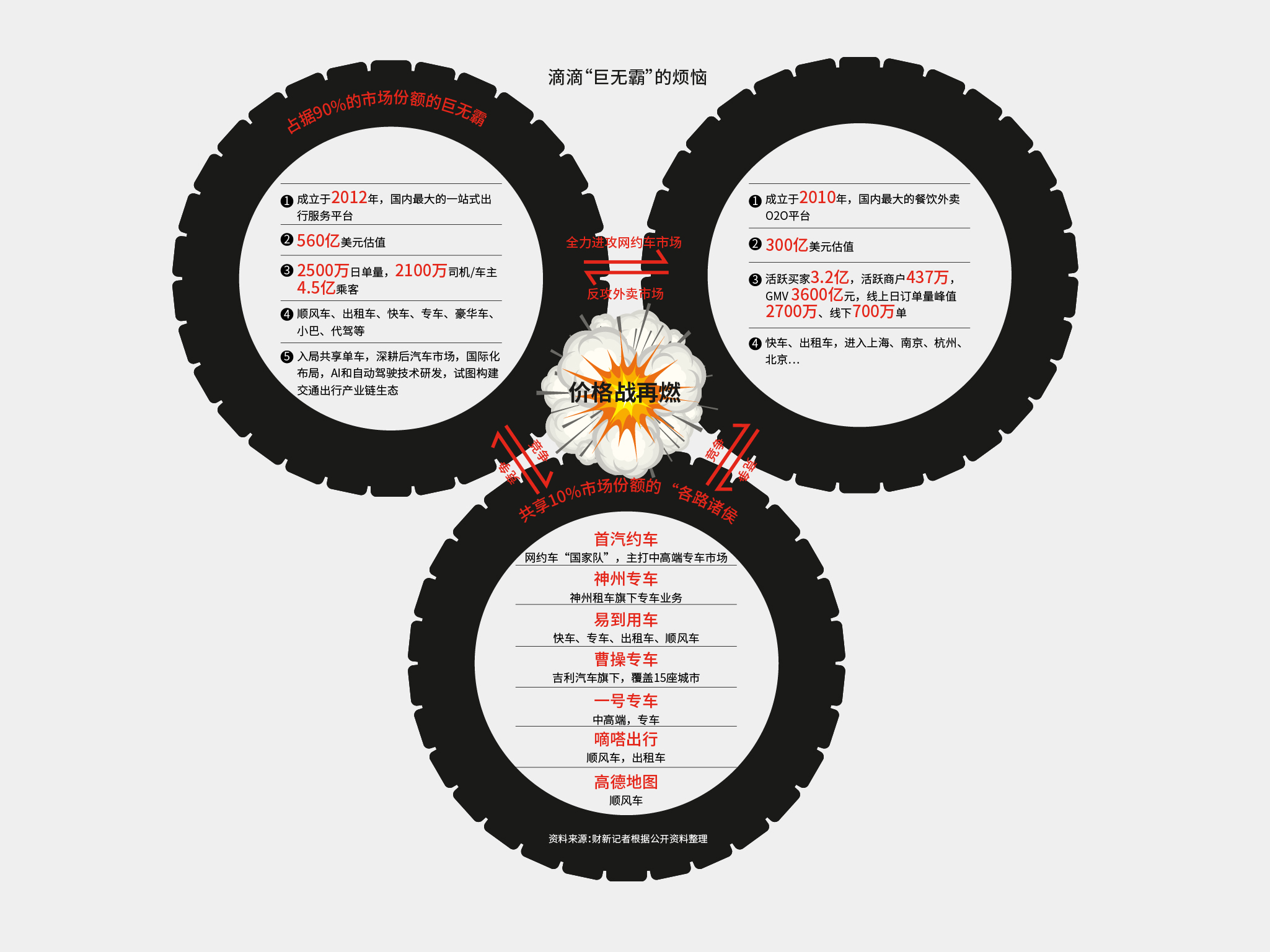 美团点评则在2017年10月完成新一轮40亿美元融资,投后估值达到300亿美元,其体量紧随滴滴。在互联网大小巨头中,美团与滴滴的发展方向最为趋同——前者欲从餐饮外卖、本地生活等O2O领域切入网约车市场,后者则在夯筑网约车护城河的同时反攻外卖市场。滴滴早在2015年11月就曾投资美团外卖当时的最大竞争对手饿了么。一名滴滴投资人告诉财新记者,就在美团预备上线打车业务时,滴滴曾和饿了么接触投资谈判,但其时已全面倒向阿里的饿了么没有接受滴滴。2018年春节后,滴滴外卖团队加速招兵买马。4月1日,滴滴外卖项目在无锡正式上线。