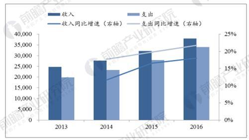 据前瞻产业研究院发布的《中国养老保险行业市场需求预测与投资战略规划分析报告》数据统计,2013至2016年,全国养老金收入及支出金额保持较平稳增长,2016年养老金收入3.80万亿元,同比增长18.0%;支出3.4万亿元,同比增长21.75%,支出增速连续超过收入增速。收支差方面,2013-2016年全国养老金基本处于盈余状态,但收支差额逐年降低。其中,2016年收支盈余额3986.50亿元,环比下降6.6%,可以看出,随着人口老龄化加剧,养老保险收支压力问题正在显现。
