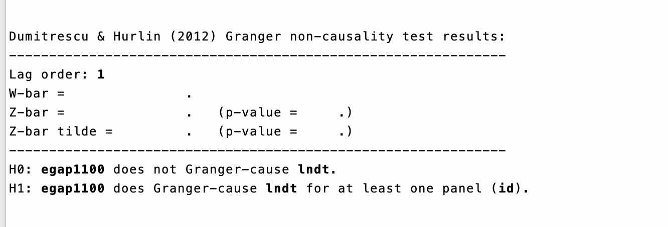 里面说:To summarise, the statistic values explained above the Granger causality process output reports the values obtained for W(W-bar), Z (Z-bar), and Ž(Z-bar tilde). Dumitrescu and Hurlin (2012) express that if N is large but T is small then Ž should be favoured. Therefore, in this paper, I test for Granger causality in the panel set by employing Dumitrescu and Hurlin (2012) xtgcause command in the Stata package using specifically the bootstrap procedure as it is also able to solve problems associated with cross-sectional dependence (Lopez and Weber, 2017).