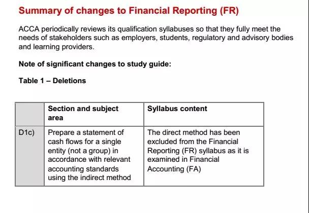 Part D1c (Part D部分的第一章单个企业财务报表的准备)删除了财务报告中的直接编制现金流量表方式,因为它已经在F3财务会计在已经有这个知识点,已有考核。