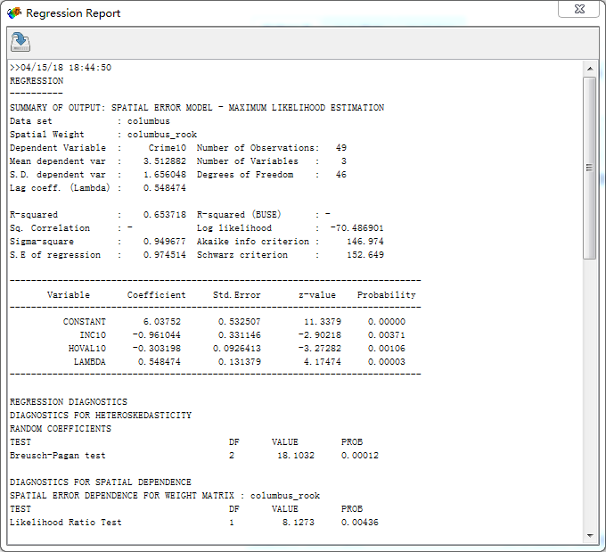求助:用Mablab和Geoda做OLS结果是一样的。但是做SLM、SEM做截面数据结果相差很大,权重矩阵是一样的。为什么?哪个结果更可信?数据都是用columbus。