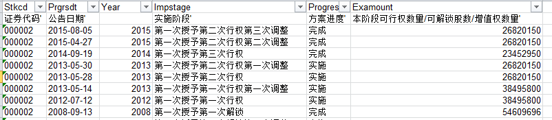 如000002中,2015年和2013年有重复数据,那么这两年的可行权数量是最新的那行的数据,还是重复年份行数据相加?