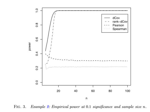 图片描述: 下图为Results of a Monte Carlo power comparison of the dCov test with classical Pearson correlation and Spearman rank tests,dcov为距离协方差