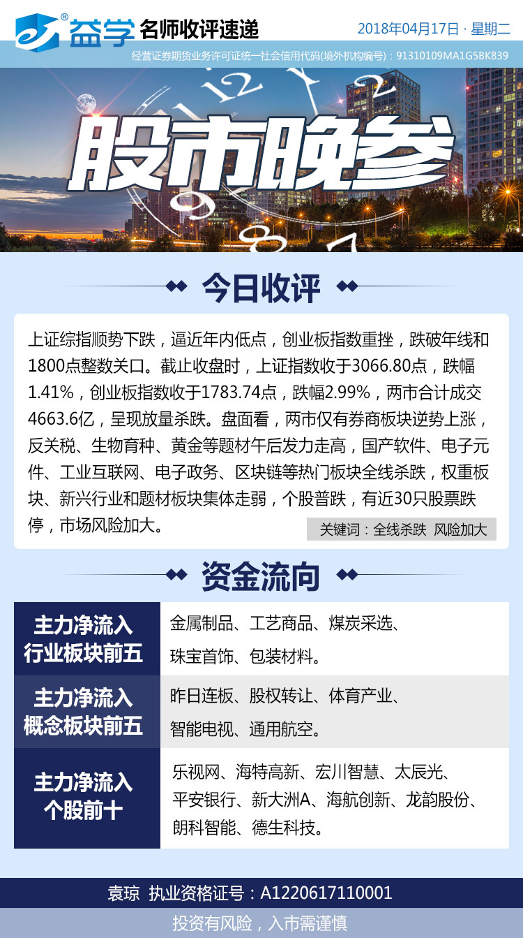 上证综指顺势下跌,逼近年内低点,创业板指数重挫,跌破年线和1800点整数关口。截止收盘时,上证指数收于3066.80点,跌幅1.41%,创业板指数收于1783.74点,跌幅2.99%,两市合计成交4663.6亿,呈现放量杀跌。盘面看,两市仅有券商板块逆势上涨,反关税、生物育种、黄金等题材午后发力走高,国产软件、电子元件、工业互联网、电子政务、区块链等热门板块全线杀跌,权重板块、新兴行业和题材板块集体走弱,个股普跌,有近30只股票跌停,市场风险加大。