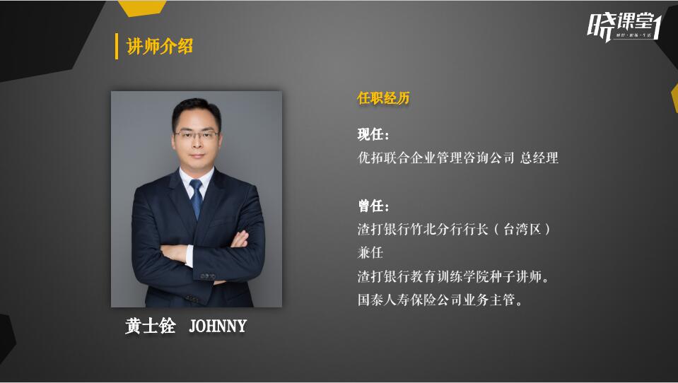 黄士铨(Johnny)在2017年10月10日吴晓波频道的分享。Johnny现在是优拓联合企业管理咨询公司总经理,曾任渣打银行(台湾)竹北分行行长,兼任渣打银行教育训练学校种子讲师,国泰人寿保险公司业务主管,有丰富的投资经验。