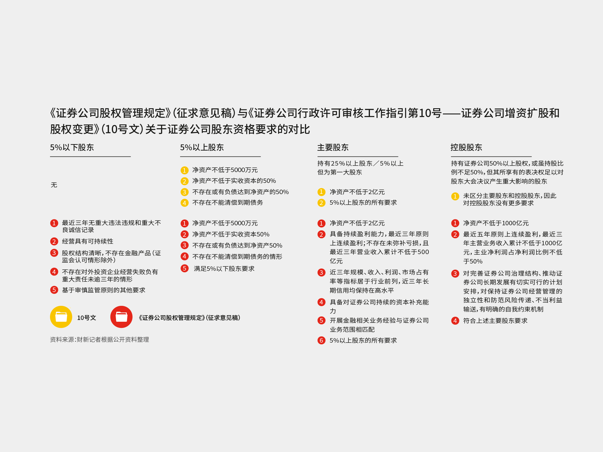 持股数量逐层递增,对股东的要求也明显开始增加。主要股东除需满足10号文中净资产不低于2亿元的要求外,还要求股东原则上最近三年连续盈利;不存在未弥补亏损、最近三年营收累计不低于500亿元;近三年规模、收入、利润、市场占有率等指标居于行业前列,具备对证券公司持续的资本补充能力等。