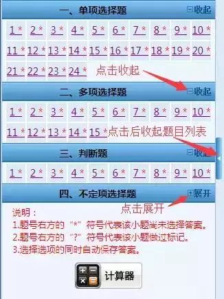 题号列表分为:单选题、多选题、判断题、不定项选择题。每个题目上都有展开按钮,还有说明: