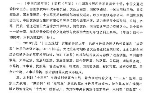 和文献性的大型年刊。《中国交通年鉴》所刊登内容,均来自国家主管部门所提供的资料和数据,经反复论证、审核和勘辑而成,具有很强的权威性、系统性和实用性。