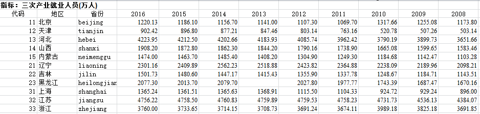 在整理数据中,需要统计各省份三次产业从业人员结构,特花了很大精力整理,都是从统计年鉴找的,包括四个部分:分省全部从业人员,分省第一产业从业人员,分省第二产业从业人员,分省第三产业从业人员。数据可靠,大家可以用附图数据进行核对。其中,1998-2010年是根据相关年份中国统计年鉴获得,2011-2016年数据是找了每一个省份的相关统计年鉴得到的。